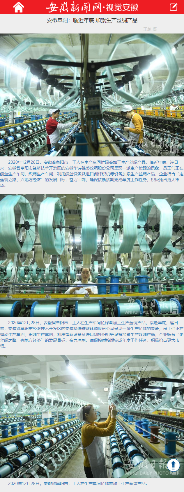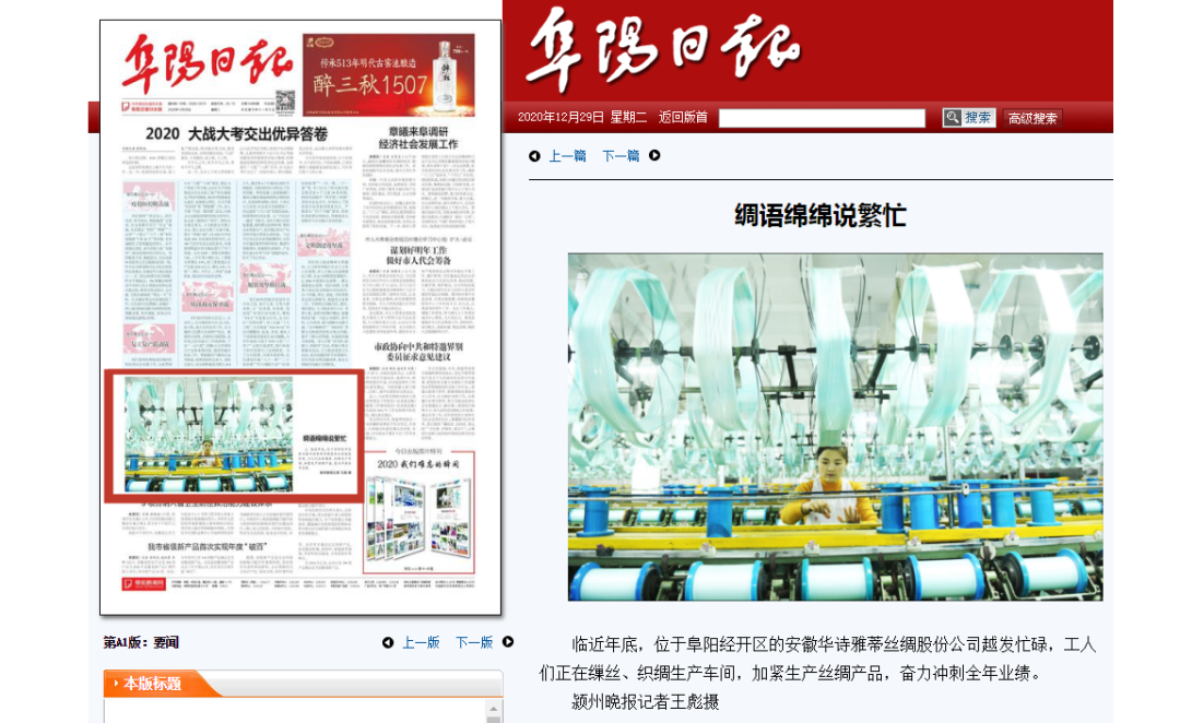 年关将近,位于安徽阜阳市经开区的安徽华诗雅蒂丝绸股份公司生产一派繁忙景象。为确保全年生产任务,积极抢占更大市场份额,车间生产人员加紧生产丝绸产品。12.29日《阜阳日报》进行了报道。《安徽新闻网·视觉安徽》同期进行了转载。
