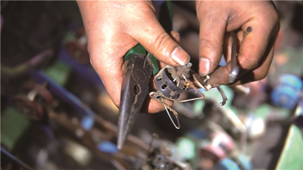 说起更换探索片,这里面还有个小插曲。公司去年初更换了两组缫丝机,旧缫丝机拆下来后,便被丢进仓库。买过家电的人都知道,买的时候贵,用过之后再卖就卖不上价了,这些旧机器也一样,丢进仓库最终只能当做废品卖。为了节约机物料消耗,刘阳最近一段时间一有空,便一手提塑料桶,一手拿着手电,领着自己刚收的学员一股脑的钻进仓库,在废旧、阴暗、狭窄的旧机器堆中寻找,寻找那些能用的,还没有磨损至报废的零部件,比如,最近他就重点在找能用的探索片。刘阳说,“别看是从旧机器上拆下来的,这还管用哩,要是买新的,得五块钱一个呢!”说着说着,他已经用钳子把探索片拧了下来。一个、两个、三个……不到半小时,他跟学员一起便收集到四五十个能用的探索片。我问刘阳:“你来这仓库几次了?”他笑道:“来N次了!这里都快让我卸完了。”这边忙着,那边还操着车间的心,刘阳看时间差不多了,打趣得跟我说:“今天捡垃圾就捡到这吧,车间机器估计该开了,咱得赶紧回去。”