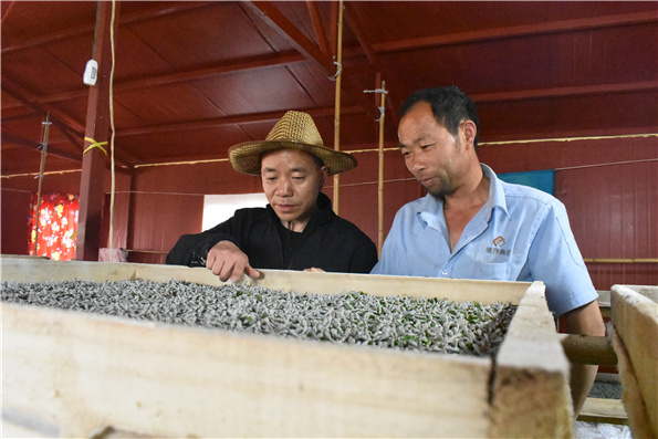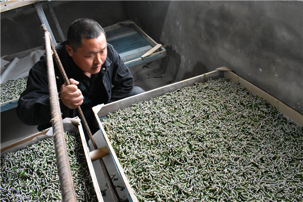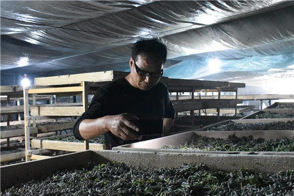刘国军2000年前后进入公司,最开始做绸缎销售工作,后来在缫丝车间当过机修工,再后来加入蚕桑办,全身心投入到公司的栽桑养蚕事业中。最近,他经常来到卢有志家中,这位蚕农已经74岁高龄,前段时间因为疏漏,屋内进了老鼠,蚕室内的蚕被老鼠吃去大半。养了十多年蚕的卢老汉并未灰心,他赶紧找到刘国军,又补了半张蚕种。刘国军这次来就是来看看后补的这些蚕长势如何,每次来他都一遍遍提醒:农药桶远离蚕室,小蚕注意保暖加湿,大蚕注意通风稀放,临走时,还会帮忙仔细检查门窗缝隙是否密封牢固,防止老鼠再次侵扰。刘国军说:“老人年纪大了,养蚕技术记不住,就需要一遍一遍的讲,他们腿脚不方便,我每次去能帮忙做的就多搭把手,毕竟卢家老两口养了好多年蚕,不能辜负了对咱的信任。而且他们是低保户,通过养蚕一年两季能挣到好几千块钱,我操点心多盯着,不想让他们辛苦一季颗粒无收!”