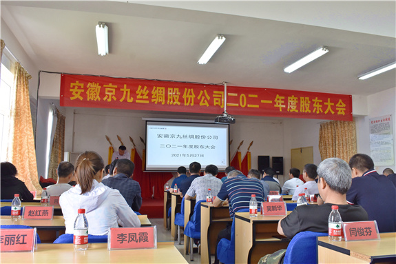 安徽京九丝绸股份公司2021年度股东大会于5月27日上午在公司办公大楼四楼会议室召开。本次股东大会已按《公司法》和公司章程的有关规定通知全体股东到会参加会议。实际参加本次股东大会和委托参加本次股东大会的股东共51人,代表股权20339525元,占自然人所持股权总数22254573元的91.39%,本次股东大会召开合法、有效。