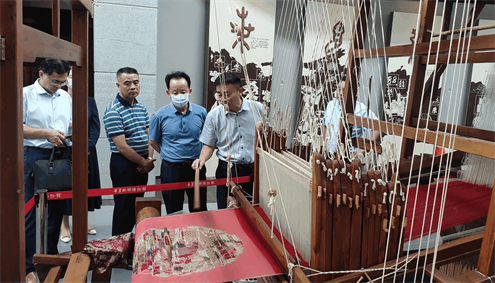 马董事长首先向张局长一行介绍了公司全产业链发展的现状,重点汇报了公司紧紧围绕丝绸产业积极做好建链、强链、补链和延链等工作。在华夏丝绸博物馆,张局长对文字的起源与丝绸对人类文明贡献的介绍极有兴趣。在大花楼织机展示区,张局长感叹古人巧夺天工的设计和能工巧匠的智慧。在丝绸产品展示区,张局长详细了解华诗雅蒂的产品结构、市场建设、品牌创新等情况,对华诗雅蒂以“丝绸+文化+旅游”的经营模式带动顾客体验式消费的创新工作给予了高度肯定。他指出,华诗雅蒂对产品负责,对消费者负责,彰显了品牌的诚信与担当,并鼓励企业继续加大产品研发与科技创新,利用好自身的优势,做大、做强品牌,为消费者提供更多、更好的丝绸产品。