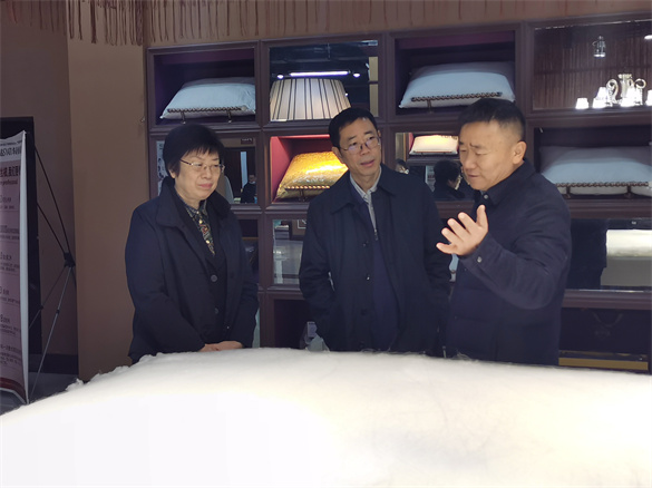 马董事长首先向领导一行介绍了公司生产经营情况和华夏丝绸博物馆的由来和使命。在工作人员的带领下,刘莉副主席饶有兴致地参观了丝路飞扬、字说丝绸、丝绸之路、华诗雅蒂产品厅和公司文化厅。她对博物馆丰富而精美的丝绸产品表示赞叹,对京九丝绸公司在丝绸文化宣传、科技创新、陈列展览、科普教育、时尚展示等方面做的工作表示肯定。