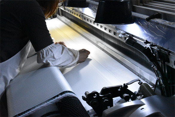 一台偌大的剑杆织机旁边,一个身形稍瘦,扎着马尾辫的女工穿梭于织布机间,戴着白色工作帽,穿着白围兜,这是纺织女工的标配,也是刘梅在车间的日常模样。