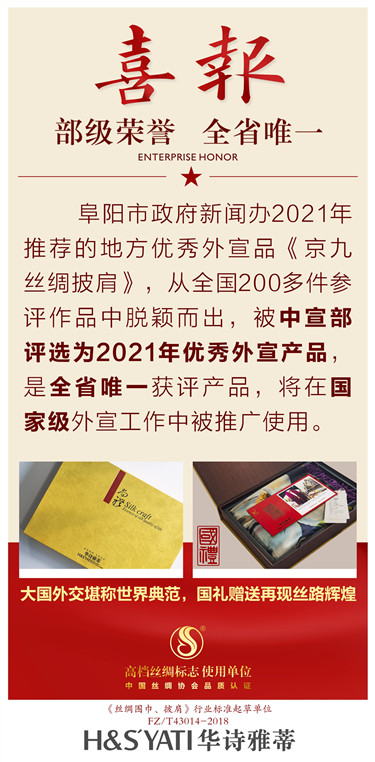 在中宣部组织的2021年地方优秀外宣品评选中,阜阳市政府新闻办推荐的地方优秀外宣品《京九丝绸披肩》从全国200多件参选作品中脱颖而出,被中宣部评选为2021年优秀外宣产品。据悉《京九丝绸披肩》是本年度评选的安徽省唯一获评产品。