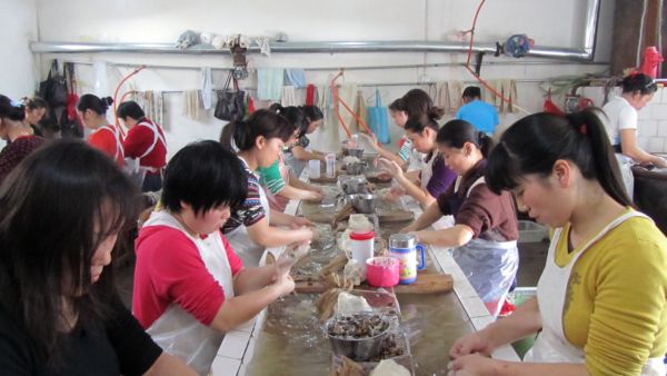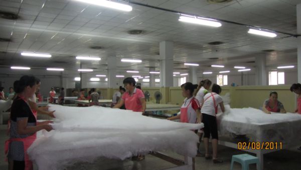 走进华诗雅蒂拳头产品“蚕丝被”生产的源头工序煮茧—剥茧生产车间,不由得感慨万端。这里的剥茧员工没有一个抬头看我的,只顾着埋头手中的活。本来好看的双手被浸泡得有些惨不忍睹,只觉一抹湿润的暖意滑过我有些潮湿了的眼眸。为了节省时间,她们中午都是自带干粮饭菜,因为多劳可以多得。徐晓华,最资深的老剥茧工了,也是每个月工资拿得最高的,月工资都在二千五以上。全神贯注的神情,一丝不苟的动作,你的眼睛不由自主的就被俘获,牢牢粘住的不愿挪开。在她的世界里只有茧,再也腾不出空隙去装下外面季节的变换与喧嚣。这需要怎样一种厚重的敬业才能支撑起这磅礴的专一与娴熟啊!