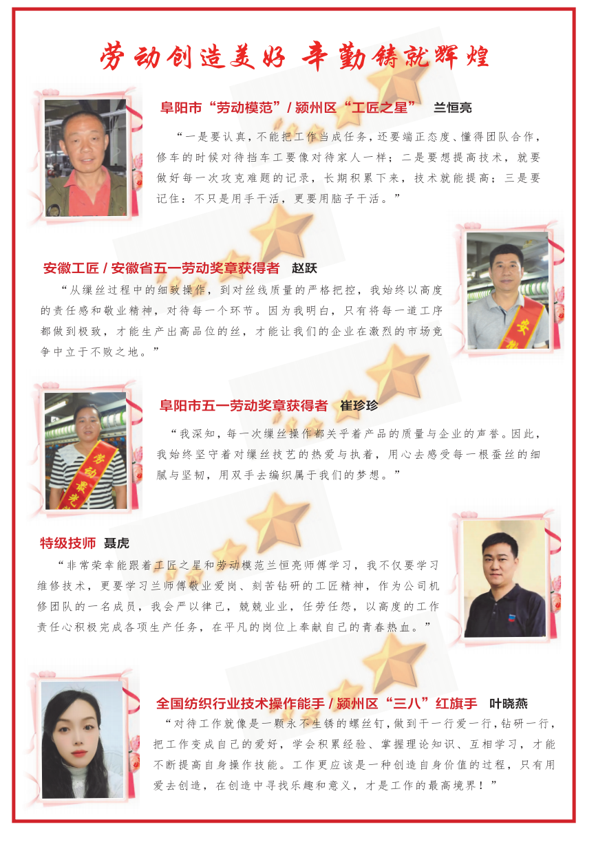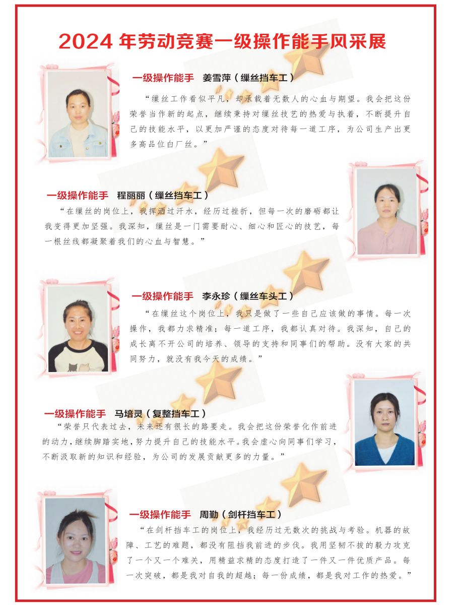 姜雪萍: “缫丝工作看似平凡,却承载着无数人的心血与期望。我会把这份荣誉当作新的起点,继续秉持对缫丝技艺的热爱与执着,不断提升自己的技能水平,以更加严谨的态度对待每一道工序,为公司生产出更多高品位白厂丝。”