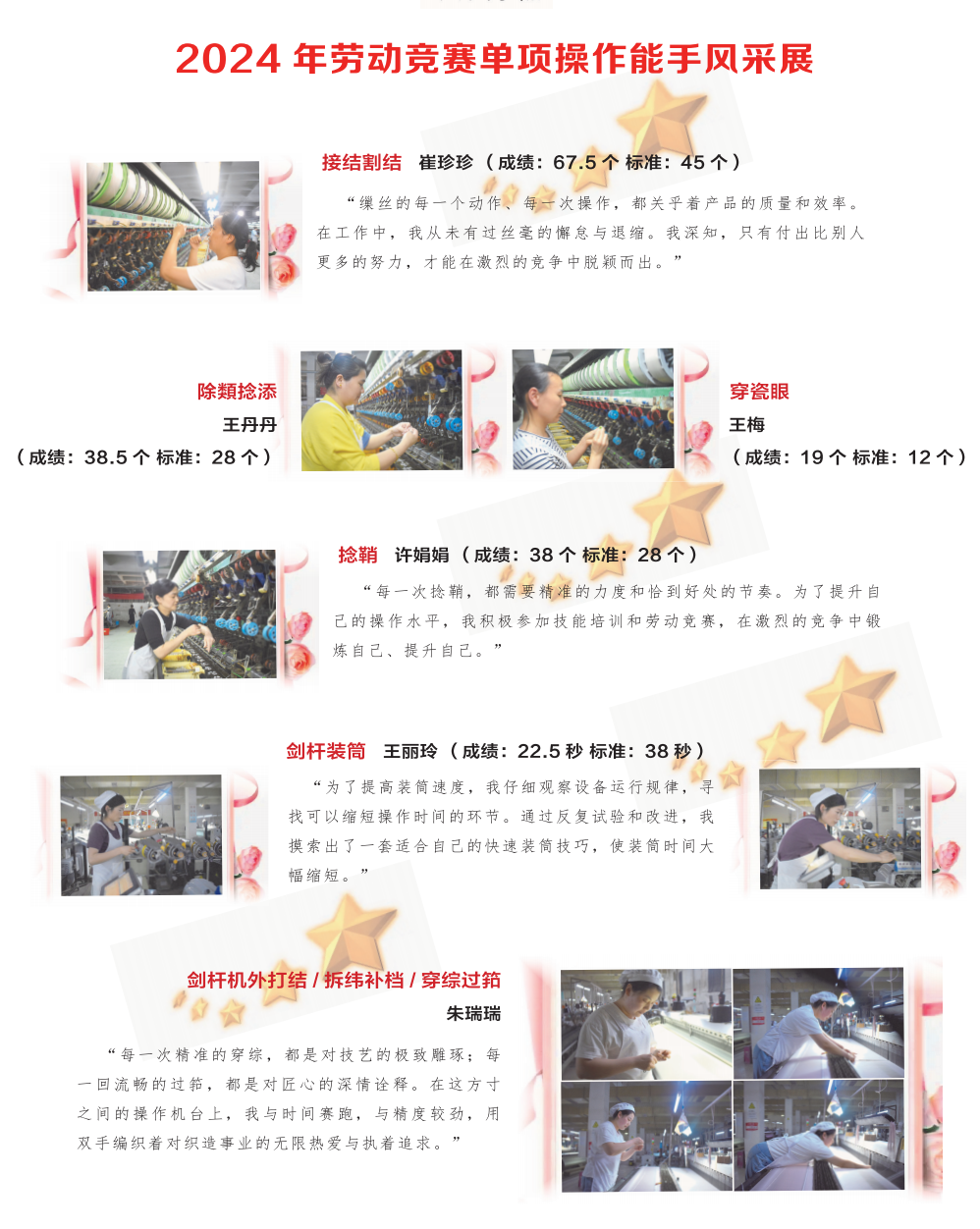 周勤:“在剑杆挡车工的岗位上,我经历过无数次的挑战与考验。机器的故障、工艺的难题,都没有阻挡我前进的步伐。我用坚韧不拔的毅力攻克了一个又一个难关,用精益求精的态度打造了一件又一件优质产品。每一次突破,都是我对自我的超越;每一份成绩,都是我对工作的热爱。”
