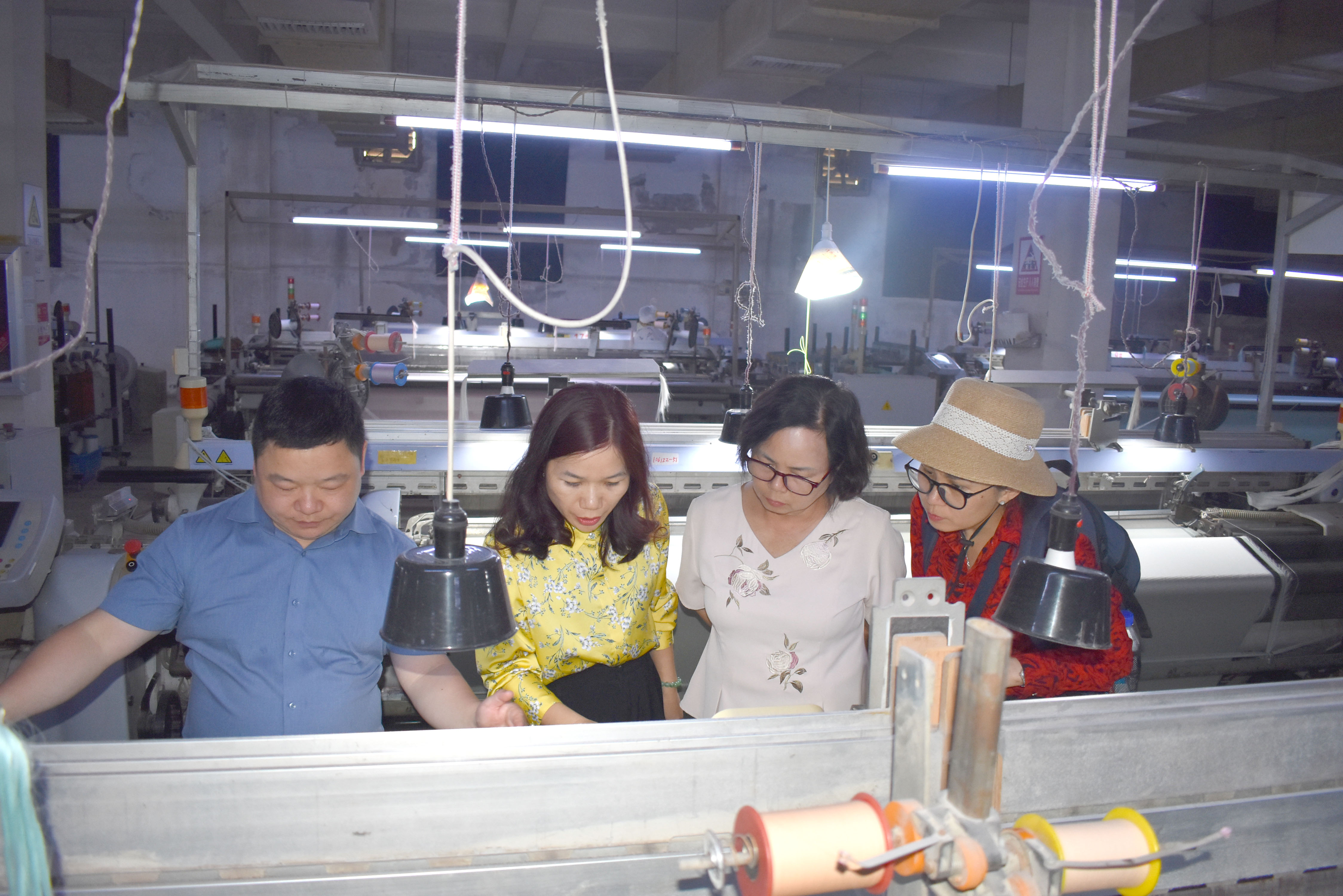 代表团实地参观了选茧、缫丝及剑杆织造车间。在选茧环节,技术人员展示了蚕茧品质的分级筛选操作,阮氏苠所长对高效精准的工艺流程表示赞赏;在缫丝车间,飞宇2000优选型自动缫丝机的稳定运行令代表团印象深刻,其6400绪的产能规模体现了国内缫丝技术的领先水平;剑杆织造车间内,意大利产剑杆织机高速运转,织就的绸缎面料以均匀的经纬密度和细腻的光泽赢得外宾好评。