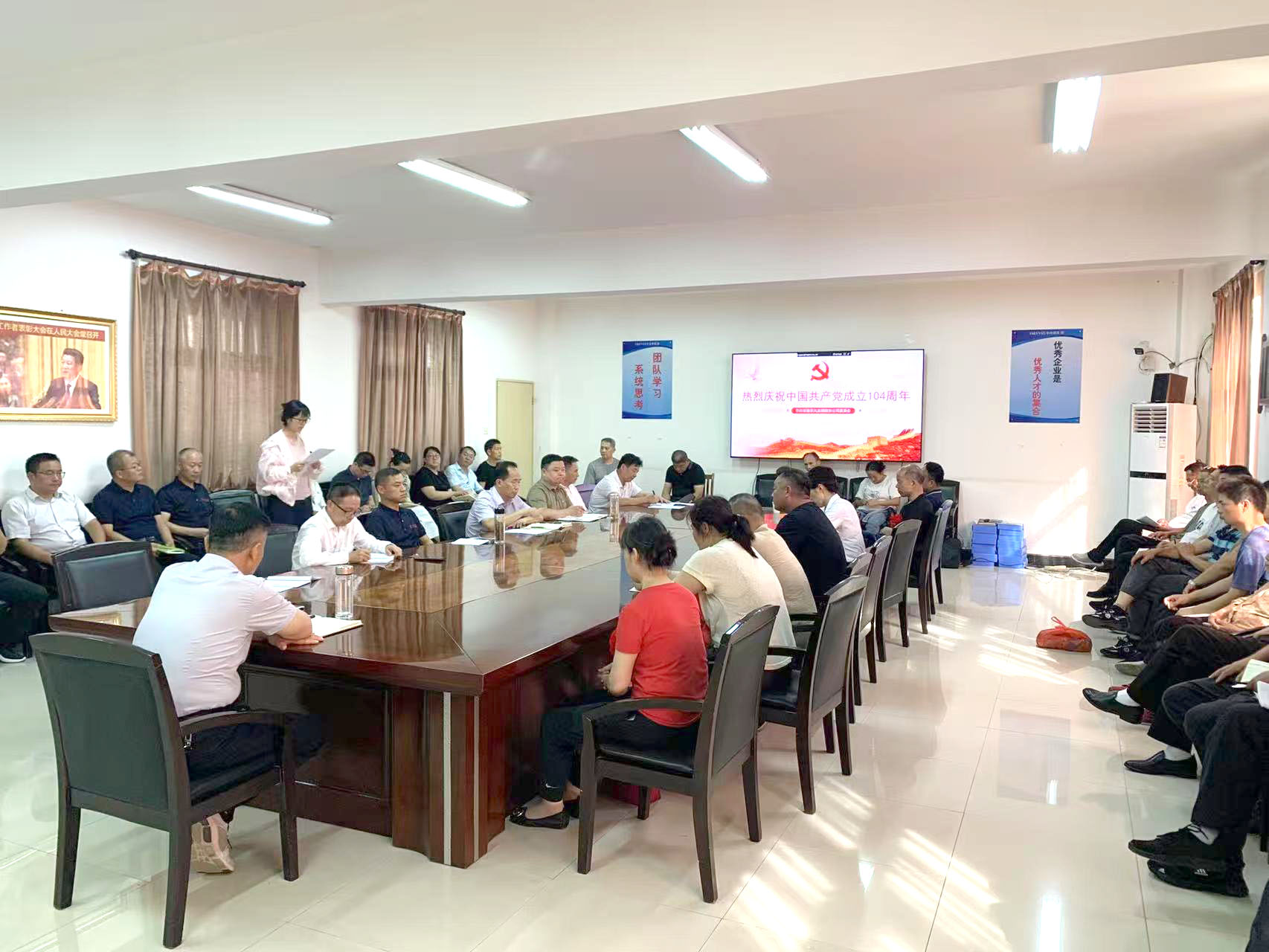 为庆祝中国共产党成立104周年,弘扬伟大建党精神,激发党员队伍干事创业热情,7月1日下午,京九丝绸隆重召开庆祝建党104周年纪念大会。公司党委班子成员、在岗党员、入党积极分子、预备党员及离退休党员代表齐聚一堂,共同回顾党的百年奋斗历程,凝聚奋进力量,共绘企业高质量发展新蓝图。