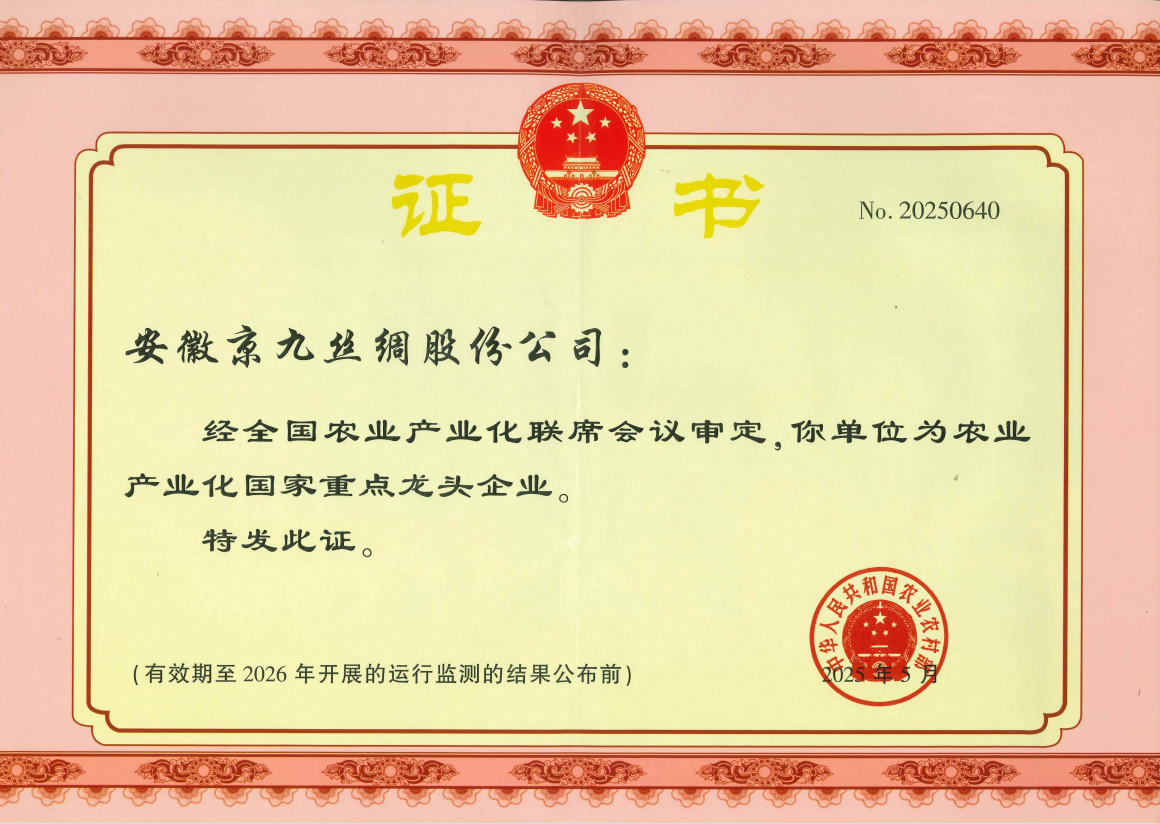 近日,经全国农业产业化联席会议审定,安徽京九丝绸股份公司凭借突出的产业实力、卓越的创新能力和强大的联农带农效应,再次被评定为“农业产业化国家重点龙头企业”。这一结果不仅是对企业持续领跑行业的权威认证,更标志着公司作为国家级丝绸产业标杆的综合实力与社会贡献获得国家层面的高度认可。