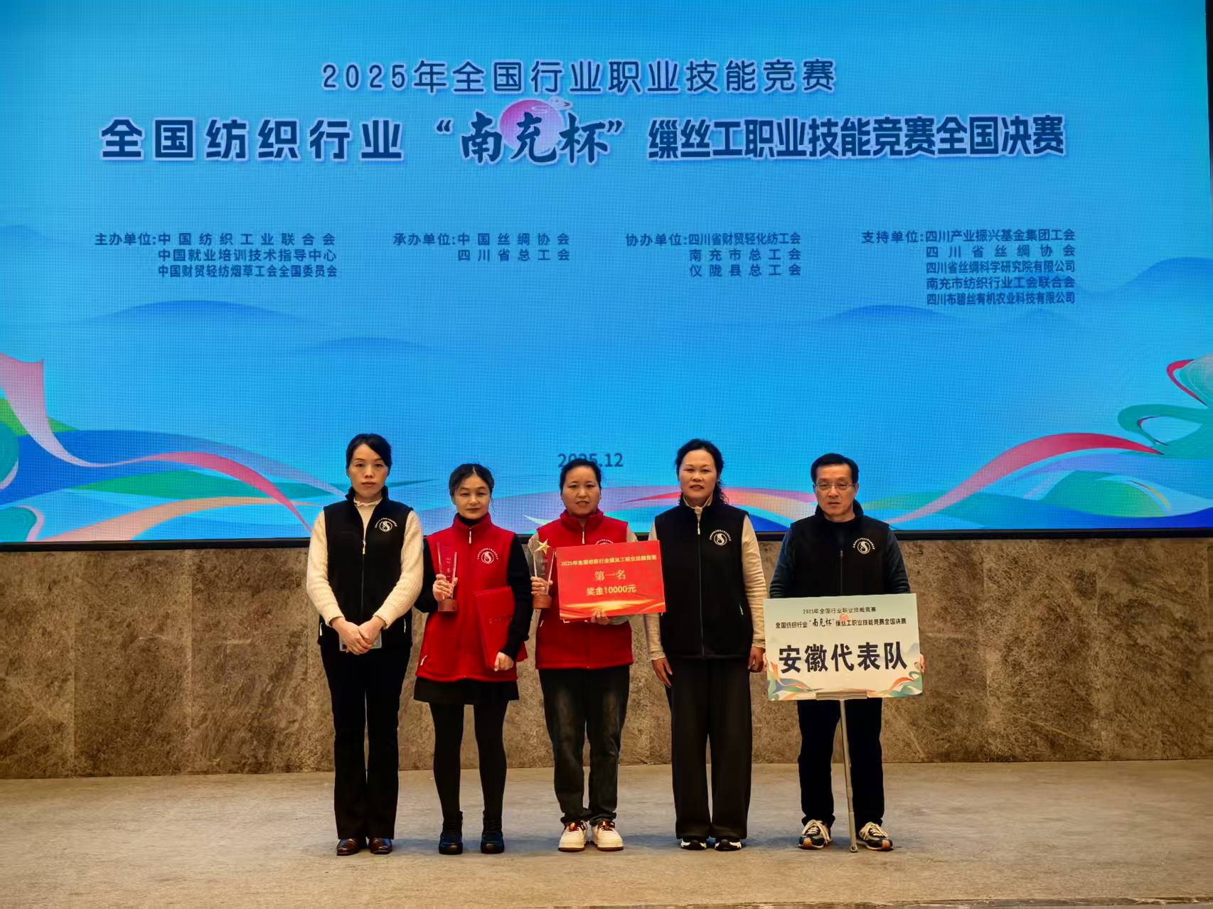 20251223日,全国行业职业技能竞赛——全国纺织行业“南充杯”缫丝工职业技能竞赛全国决赛在四川省仪陇县德园广场盛大启幕。这场由中国纺织工业联合会、中国就业培训技术指导中心、中国财贸轻纺烟草工会全国委员会联合主办,中国丝绸协会、四川省总工会承办的国家级赛事,吸引了来自浙江、江苏、四川、广西、安徽、山东、重庆、云南等8个省(区、市)的36名顶尖缫丝工匠同台竞技。经过三天激烈角逐,我公司选手崔珍珍以精湛技艺和稳定发挥脱颖而出,夺得总成绩第一名许娟娟单项操作第一,成为全国缫丝行业技能标杆!