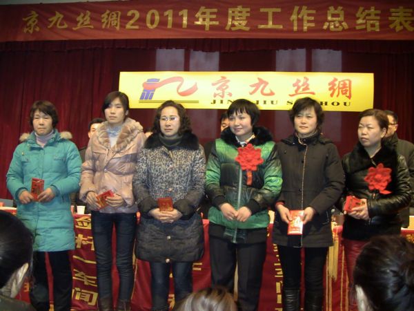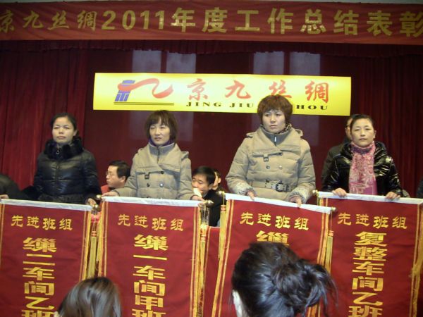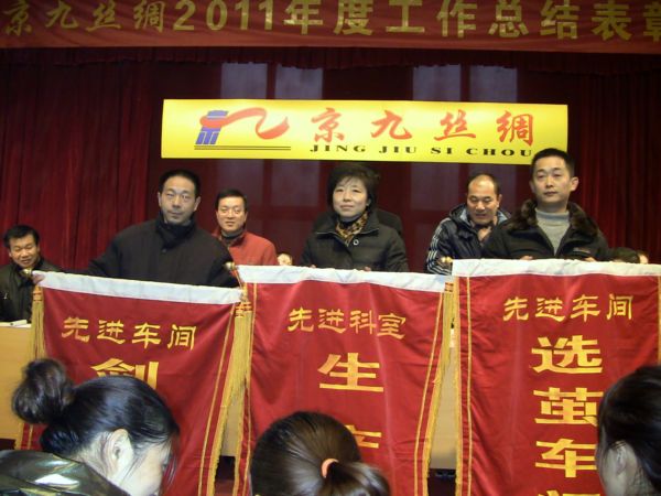 李开典总经理在总结报告中对2011年工作情况进行了回顾,对2012年的工作进行了展望。报告指出:2011年是公司经受内外影响最多、生存发展最艰难的一年,面对前所未有的困境和残酷的现实,京九丝绸人以一惯的大无畏精神挺立风口浪尖,乘风破浪,披荆斩棘。公司上下坚持以科学发展观统领全局,围绕“调结构、创品牌、促升级”为主线,以技改创新和品牌培育为重点,以加强内部管理为抓手,紧紧依靠广大管理干部与员工锐意进取,奋力拼搏,产业经营维持了一定规模水平,科技创新取得新突破,品牌战略创造新业绩,制度改革呈现新亮点,队伍建设彰显新风采,集团形象得到新提升。