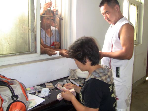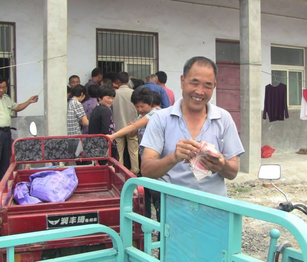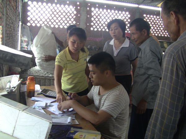 开磅的第二天,在耿棚收购点来卖茧的特别多,杨锡兰一天开票200多份,连续不断的手工开票,手都磨出泡了;财务人员李晓华,一天手工兑付现金近70万,一直忙着低头数钱,这真叫数钱数到手发软!从早上六点多开始,一直到晚上七点多才结束,忙的早饭都来不及吃,午饭要等到下午3点,如此紧张忙碌的情况下,工作人员依然保持小心谨慎的态度,认真对待每位来卖茧的蚕农,确保公平公正。打价人员更是累的口干舌燥,声音嘶哑,因为他们不仅要和蚕农正常的讨价还价,偶尔还会发生争执争吵,碰到不理解的,我们的工作人员会受到辱骂,甚至厮打等委屈。大部分的蚕农还是通情达理的,因为打价人员都是蚕桑办的技术能手,他们与蚕农长期的相处培养了深厚的感情,像这种情况只是个别现象,委屈与泪水也是他们工作中的一部分,习以为常了。还有负责运输的司机,每次收茧他们要加班加点,从阜阳周边地区收的茧要及时送到耿棚烘茧厂,有一次,司机李庆新师傅从五十铺拉一车茧送到耿棚,又从耿棚到滑集,从滑集拉一车茧再回耿棚。从滑集出发时已经是晚上七点多了,把茧送到耿棚然后驱车回家,到了阜阳已是夜里12点多了,第二天一早又要下乡收茧。