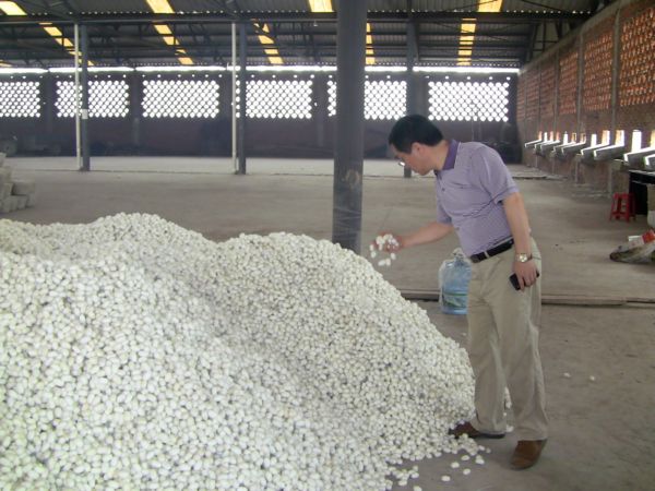今年蚕茧的收购价格受大环境影响,和去年同期相比有所下调,但是为了鼓励农民栽桑养蚕,公司在生产经营极其困难的情况下,依然优先考虑蚕农的利益,今年春茧均价23.5元/斤,比去年秋茧每斤高3元,比今年春季全国市场平均价每斤高7元左右。蚕农每张蚕种收入达2000多元,秋季收成如果按照当前情况计算的话,每亩桑园年收入多达七八千。如耿棚镇蚕农卢友华,今年春季养了7.5张蚕种,平均每张产量达80多斤,共收入15000多元;卢友连家属,快七十岁了,几分地的桑园,养了一张蚕种,收了89.8斤鲜茧,收入两千多元,按一年养春秋两季计算,仅此几分地的桑园,收入就是四五千元;还有蚕农周伦清,一个家庭妇女,一亩多的桑园,春季养了两张蚕种,结茧184斤,收入4400元;还有赵元庭老两口,这次养了15张蚕种,收入25440元,像这种蚕茧质量好、产量高的农户还有很多。为了提高蚕茧质量以及蚕农的收入,多年来公司免费提供技术指导、技术培训,尤其是养蚕期间,技术员深入到一家一户进行技术指导。养蚕很辛苦,喂养过程需要非常小心,每一个可能出现的意外都要考虑到,一点也马虎不得,蚕桑办技术人员长期和蚕农生活在一起,时刻观察蚕的生长情况,发现问题及时解决,最大程度减少蚕的发病率。
