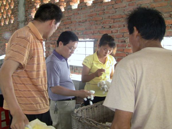 安徽京九丝绸股份公司2012年春茧收购于6月4日开磅,为了及时把茧收完不耽误蚕农收麦,此次收茧共分三组,一组在耿棚收购,其他两组在阜阳周边散点地区,定点收购,为蚕农提供方便,省时省力。