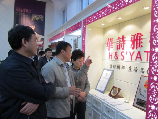 10月23日下午,中共安徽省委常委、统战部部长沈素琍在中共阜阳市委书记、市人大主任宋卫平等领导的陪同下莅临公司检查指导工作,公司董事长马品德代表公司热情接待了上级领导一行的到来。沈素琍一行深入生产车间一线,兴致勃勃地参观了公司的整个生产流程,察看了公司在缫丝与织绸上引进的最新机械设备与新研发的产品生产情况,并饶有兴致地参观了公司的终端品牌“华诗雅蒂”产品展示厅。特别是在展示厅里,董事长具体而生动的介绍给随行的各位领导对公司“华诗雅蒂”丰富多彩的系列产品带来了浓厚的兴趣,笑意频频中不时伸出手来感应体验丝绸产品的柔顺与舒适感,尤其是对运用现代数码专利技术与传统丝织工艺结合的具有中国深厚传统文化底蕴的传统文化礼品系列的精美与神韵赞不绝口。