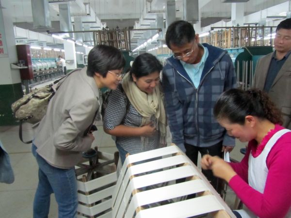 接着深入生产一线,先后参观了剑杆车间、准备一车间、准备二车间、选茧车间、缫丝车间、复整车间以及丝绵车间,每到一处,专家们都仔细观看、详细询问。