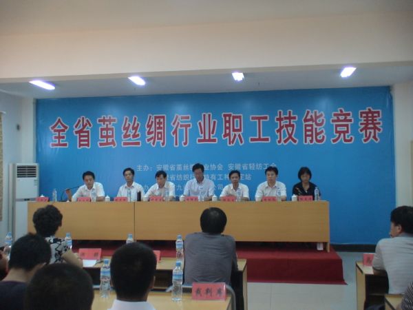 9月19日下午,由省茧丝绸行业协会、省轻纺工会、省纺织行业特有工种鉴定站、安徽京九丝绸股份公司共同举办的“全省茧丝绸行业职工技能竞赛”在京九丝绸办公大楼四楼会议室拉开序幕。阜阳市人民政府副市长胡明莹出席开幕式并致欢迎辞,省茧丝绸行业协会会长、省商务厅副厅长张光建在开幕式上发表了重要讲话。张厅长对近年来京九丝绸的快速发展及取得的成绩给予了充分的肯定和高度的赞扬,对本次竞赛产生的作用与意义进行了深刻的阐述与总结。省丝绸行业协会常务副会长,本次竞赛组委会副组长孙永彬主持了开幕式。