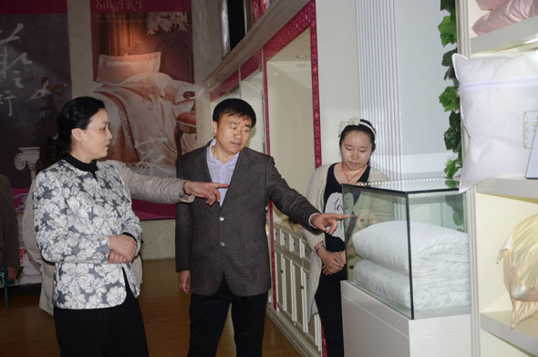 李素萍一行在马董事长的陪同下深入生产一线,先后参观了缫丝车间、剑杆车间等生产现场,实地察看了公司的生产流程,详细了解了丝绸的生产过程以及女职工的工作环境和生活等方面的情况。在华诗雅蒂产品展示厅里,公司有关负责人向李主席一行详细介绍了展厅里琳琅满目的真丝产品:有真丝睡衣、丝巾、领带等传统的家饰家纺类真丝产品,还有科技含量很高的精装丝绸珍藏版《孙子兵法》、《管子》、《道德经》、以及立体真丝织锦画《梅兰竹菊》等现代丝绸工艺品。其中主打产品要数蚕丝被,蚕丝被品种繁多,品质上乘,从子母被到春秋被、冬暖被、夏凉被再到蚕丝毯等,不同类型尽力满足消费者的不同需求。代表着高端生活品味且引领时尚潮流的华诗雅蒂真丝系列产品让李主席一行产生了浓厚的兴趣,纷纷伸手触摸、亲身感受真丝产品带来的丝爽顺滑,并啧啧称赞京九丝绸在马品德董事长的带领下取得的迅速发展。