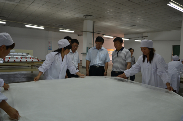 随后杨会长一行不辞辛苦驱车来到公司,深入生产车间察看了热火朝天的生产现场,对华诗雅蒂产品展示厅及正在投建中的华诗雅蒂丝绸科技博物馆给予了高度的评价与期望,对京九丝绸在茧丝绸市场经济下行不利的重重困难中所获得的稳步发展及取得的成绩深感欣慰,鼓励企业再接再厉,积极稳健地把握好市场风险,加大自主品牌的研发与创新力量,为民族丝绸的发展作出更大的贡献。