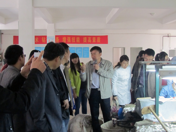 马董事长在介绍公司近年来的生产经营与品牌发展情况时,说到为加快公司转型升级,增强企业市场竞争力,公司一直将创新作为企业转型升级的支撑和动力。随着董事长的陪同刁主任一行饶有兴致地参观了公司刚投建使用的烘茧厂,在生产一线车间内认真听取了马董事长对相关工艺与生产流程的介绍。当看到宽敞干净的车间内织机轰鸣,一线员工都在有条不紊地工作时,刁主任一行对此颇为赞赏。