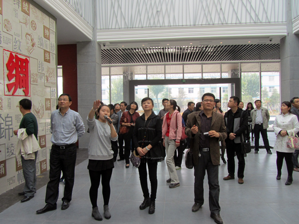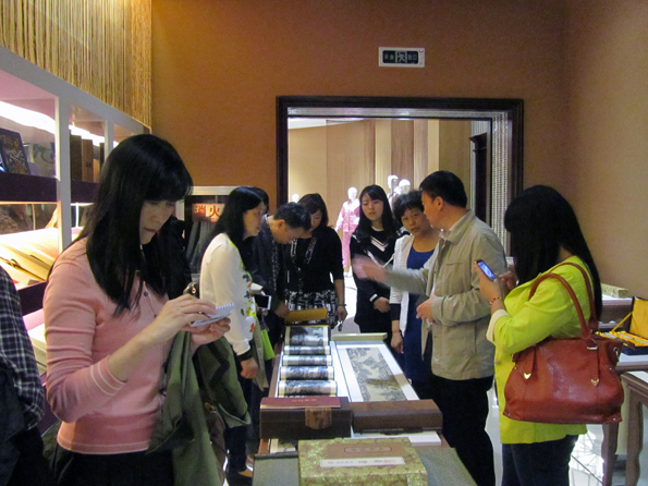 当大家来到已经竣工正处于整体布置、产品陈列中的华夏丝绸博物馆时,刁主任一行纷纷啧啧称赞京九丝绸独特的企业文化特色及博物馆充满创意的设计理念与视觉效果。从源远流长的丝绸文化到如今习主席再次倡导丝绸文化之路,从博物馆各厅的功能到陈列特色,华诗雅蒂工作人员梅玉祥逐一详尽地向刁主任一行热情介绍着。各厅内琳琅满目的家纺、服饰、围饰、文化类等丝绸产品让考察团一行目不暇接,喜悦不已。尤其当女士们看到花型绮丽、质地轻软的那一款款拉绒围巾、真丝丝巾时,纷纷驻足伸手感受一番,争相询问尺寸、价格。当来到丝绸文化创意展厅,看到现代高科技的结晶——丝绸织锦画时,忍不住纷纷盛赞这一高品质、高品位的丝绸文化礼品。在蚕丝被产品展厅,马董事长介绍说,由于丝绸制品与生俱来的天然、健康元素使得华诗雅蒂蚕丝被自上市以来就倍受广大消费者的青睐与好评,不断提高的市场占有率与良好的口碑是华诗雅蒂经典主打产品蚕丝被优良品质的有力证明。大家也纷纷表示将拭目以待即将闪亮开馆的华夏丝绸博物馆。
