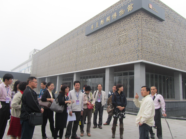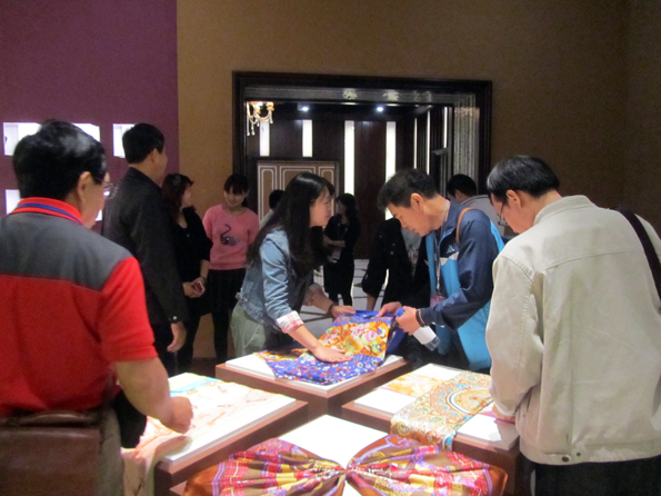 考察团一行在简单听取了总经理对企业规模与发展现状后目标明确直奔“华夏丝绸博物馆”,围绕着丝绸文化的一种延续和传承的丝绸博物馆虽初步成型但诸多设施摆署百事待兴,考察团一行尽管面对是简单尚未成型的摆施却饶有兴致,感慨唏嘘,啧啧称赞。一是唏嘘中国丝绸真的是绚丽多彩,织染技术高超,服饰文化博大精深,大大开了眼界;二是称赞远离苏杭丝绸业发达的皖西北地区竟然也有如此规模与先进的优秀丝绸企业,实属难得。当考察团一行进入丝绸产品展示的一个丝巾展厅后,一直在快速行进赶时间的考察团都纷纷驻足不前了,面对色彩缤纷、款式多样的丝巾赞不绝口、爱不释手,有的当场就信手拿下五六条丝巾一口气要买下,直到领队反复再三的催促才恋恋不舍地离开。