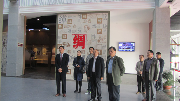 农工党中央一行怀着浓厚的兴致依次参观了博物馆内的各个展厅,从“蚕、桑、丝、帛”为主题的字画,到图文并茂的“螺祖始蚕”、“张骞出使西域”、“黄道婆传道”、“郑和下西洋”等历史故事,目睹了一场盛大的传统工艺丝绸文化视觉盛宴。尤其是在丝绸文化产品展区,对由丝绸制作而成的图书、画册、画幅的精良制作及繁多种类深感敬畏,赞叹不已,并纷纷以其背景拍照留影。
