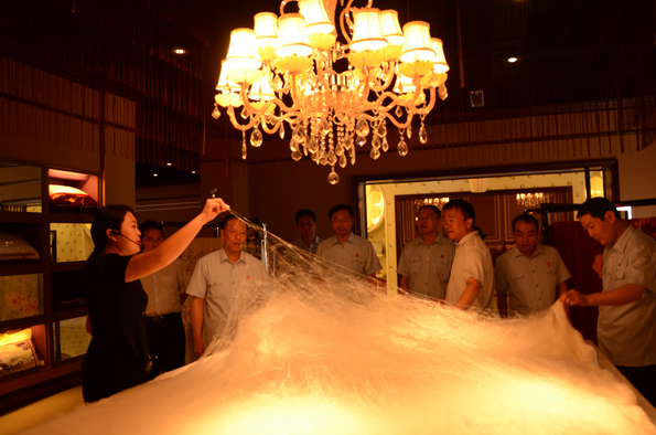 马董事长在介绍时说道:“从栽桑养蚕到缫丝再到织造最后到丝绸成品,公司已形成了一条内涵丰富、实力雄厚的完整产业链。每个环节中注重创新发展,比如在养蚕的环节中其温度、湿度的控制,缫丝中煮茧的技术,华诗雅蒂新产品的开发等等,都体现了很高的工艺水平。”在整个参观过程中,张院长一行表现出了浓厚的兴趣,每到一个生产车间都仔细观察其相关的生产工艺与产品。