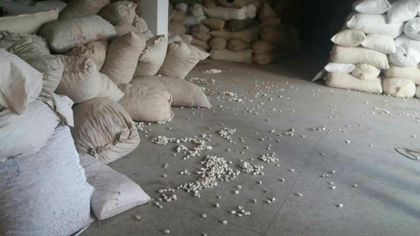 一张茧库工作现场照:撒落了一地白花花的茧!