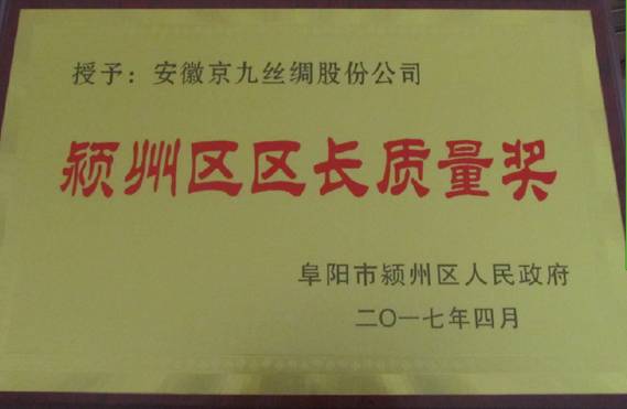 2017423日,安徽京九丝绸股份公司副总经理葛炯代表公司参加了“颍州区区长质量奖”的表彰仪式,奖励公司2016年在推行“卓越绩效”活动中取得的成绩,这是公司继2015年荣获“阜阳市市长质量奖”的又一质量荣誉。