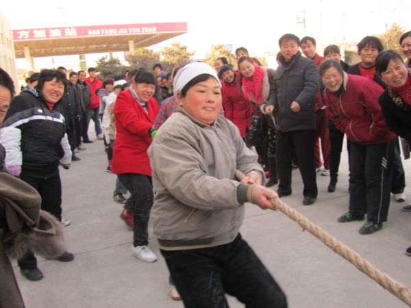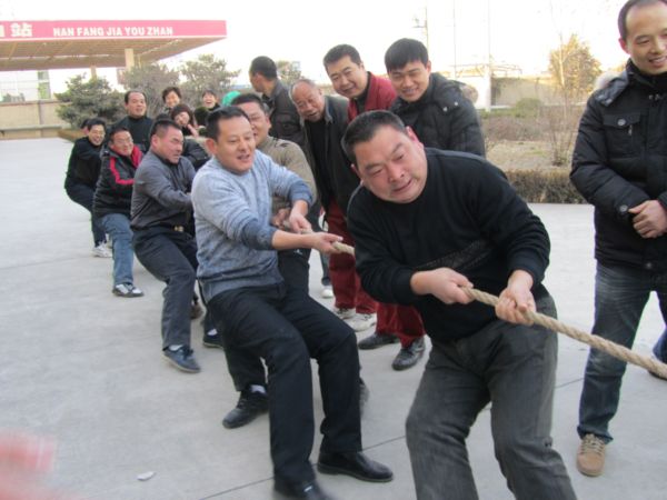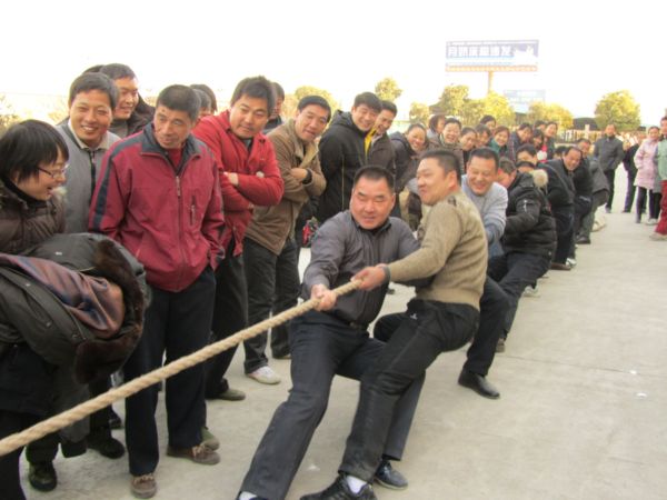 12月31日下午3时,拔河比赛正式开始。赛场设在办公楼前的旗杆下,由于参赛人数较多,女子7个队,男子6个队,每队10人,光参赛队员就达130人,加上观众,现场热闹非凡。道路两旁挤满了围观的员工,他们为各自的队伍加油呐喊,掌声雷动,场面异常热烈。呐喊声惊动了马路上的行人,他们也好奇地停下了匆匆行走的脚步,探头张望。随着主裁判汪晓飞的一声哨响:“各个就位,开始!”比赛正式拉开了序幕,双方你来我往,咬紧牙关,拼尽全力,啦啦队也在不遗余力地为队员加油助威,声彻赛场,很快第一轮比赛结束,进入了紧张的第二轮。