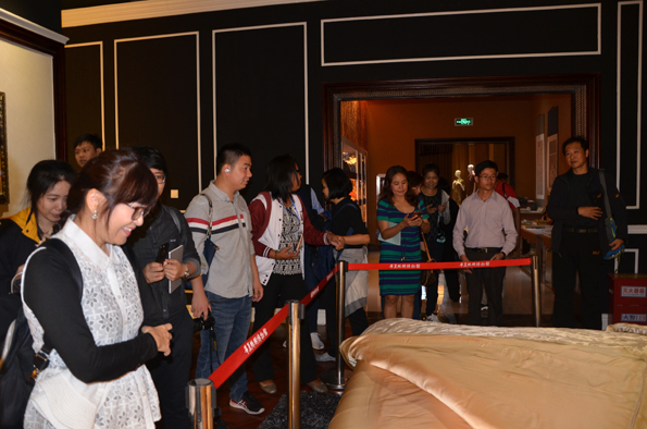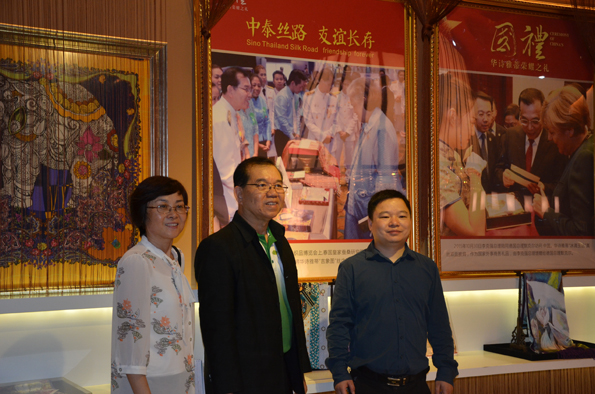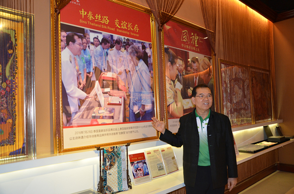 2016年7月28日,在泰国皇家丝织品博览会上,泰国皇家桑蚕研究院的Wiroje先生向泰国公主诗琳通介绍华诗雅蒂品牌并将华诗雅蒂“吉象图”丝巾赠与公主。今日,Wiroje先生在华夏丝绸博物馆中再次与赠与泰国公主诗琳通的“吉象图”合影。