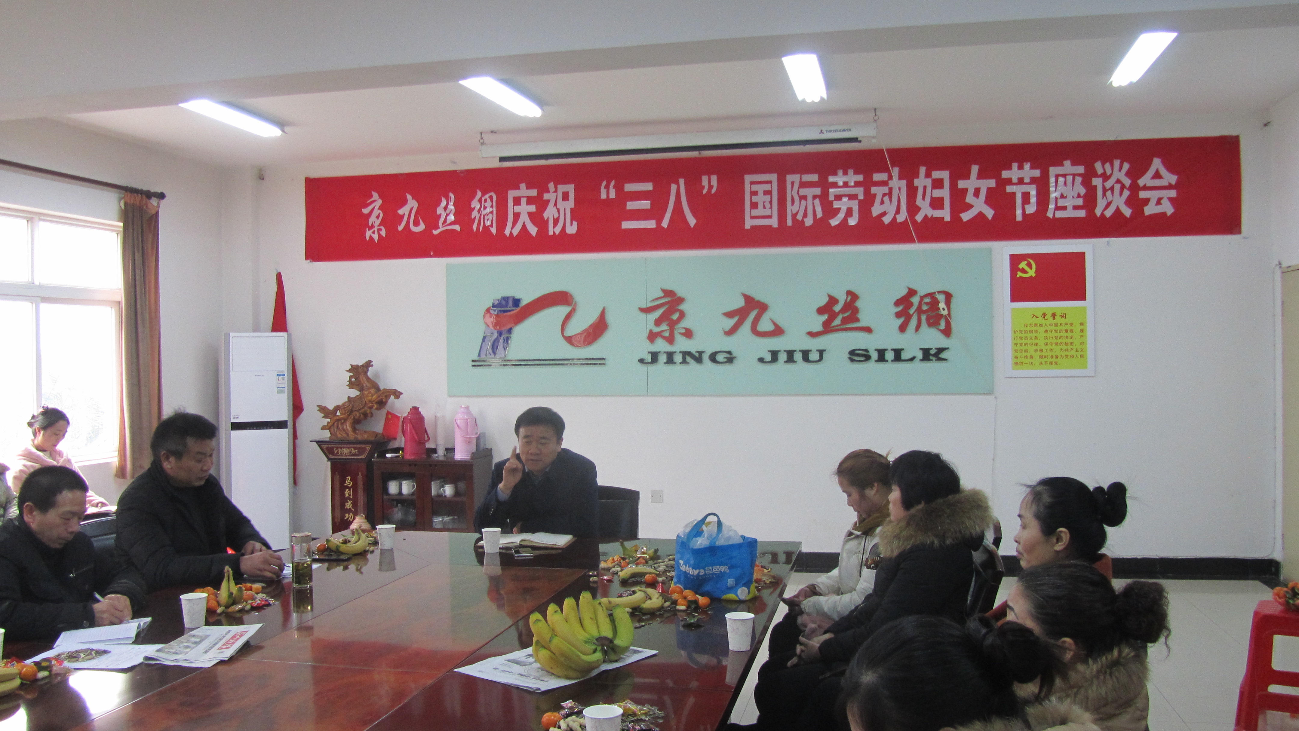 3月8日下午,为庆祝第108个“三八”国际妇女节,由公司党委主持并组织机关科室,各车间优秀、先进女职工代表等共计60多人,在二楼会议室隆重召开了“庆三八”座谈会,公司党委书记、董事长马品德一如既往地亲临会场,机关支部书记唐贺强、缫丝支部书记左然生、德源支部书记宛俊峰参加了本次会议。