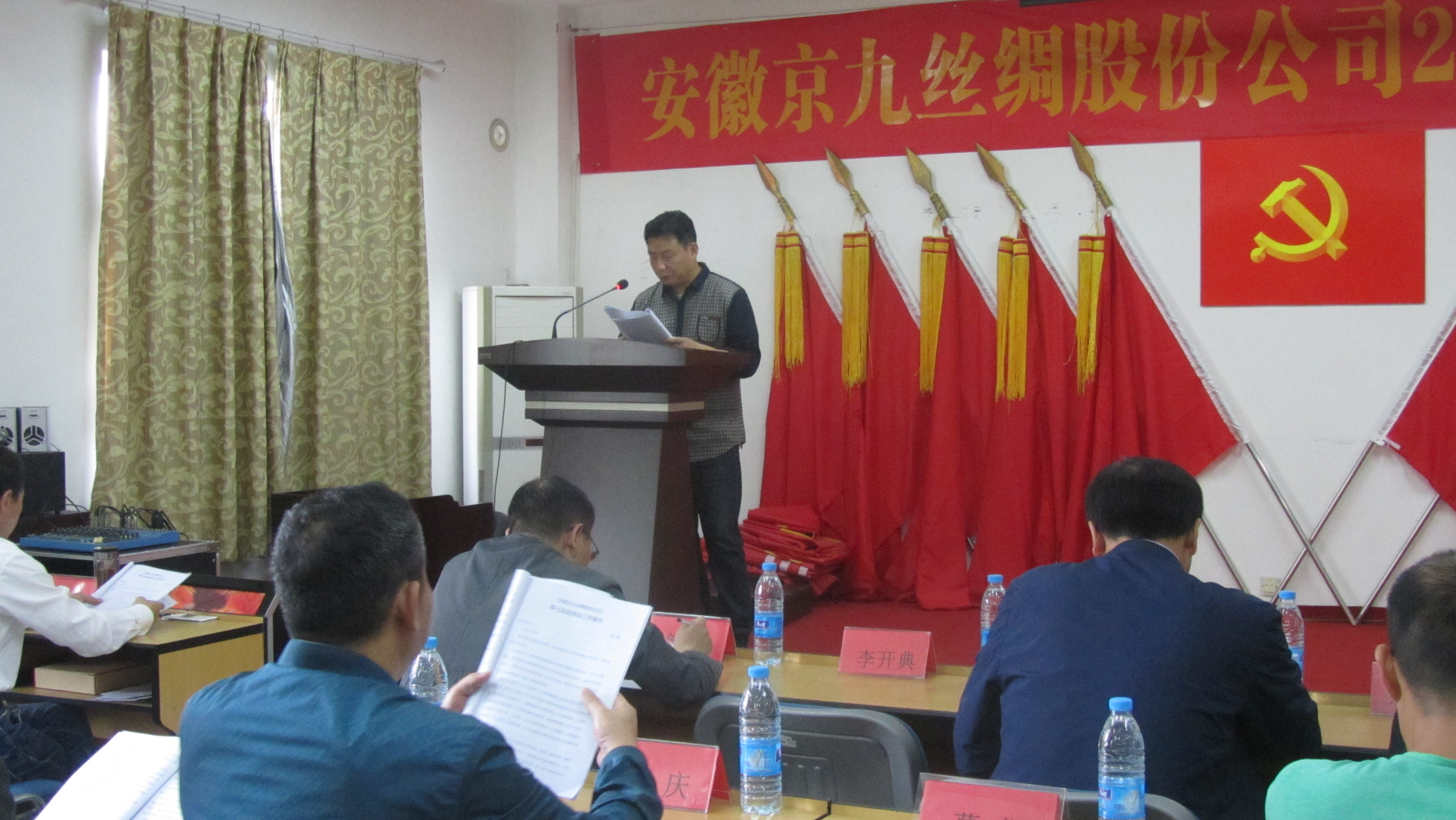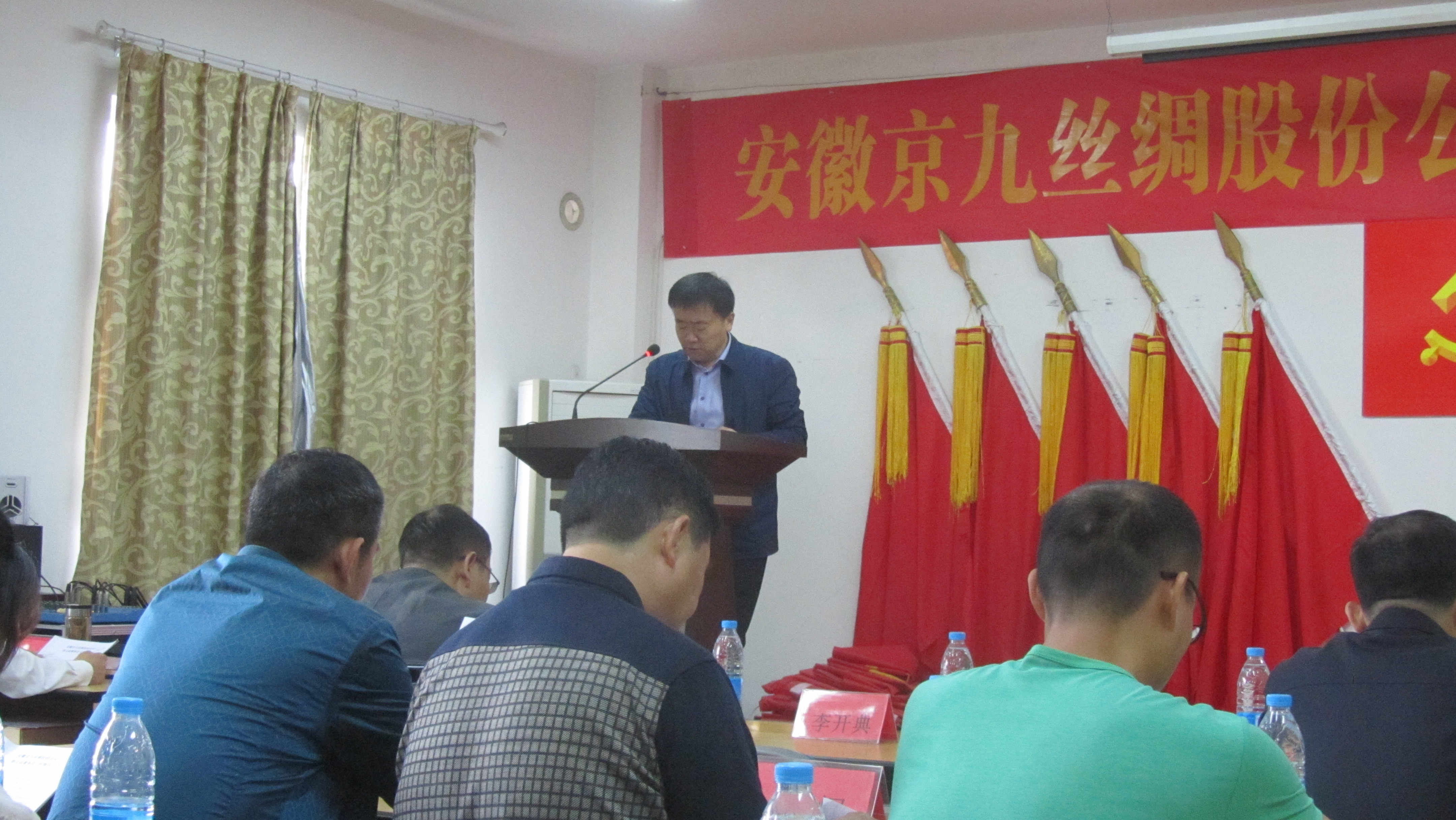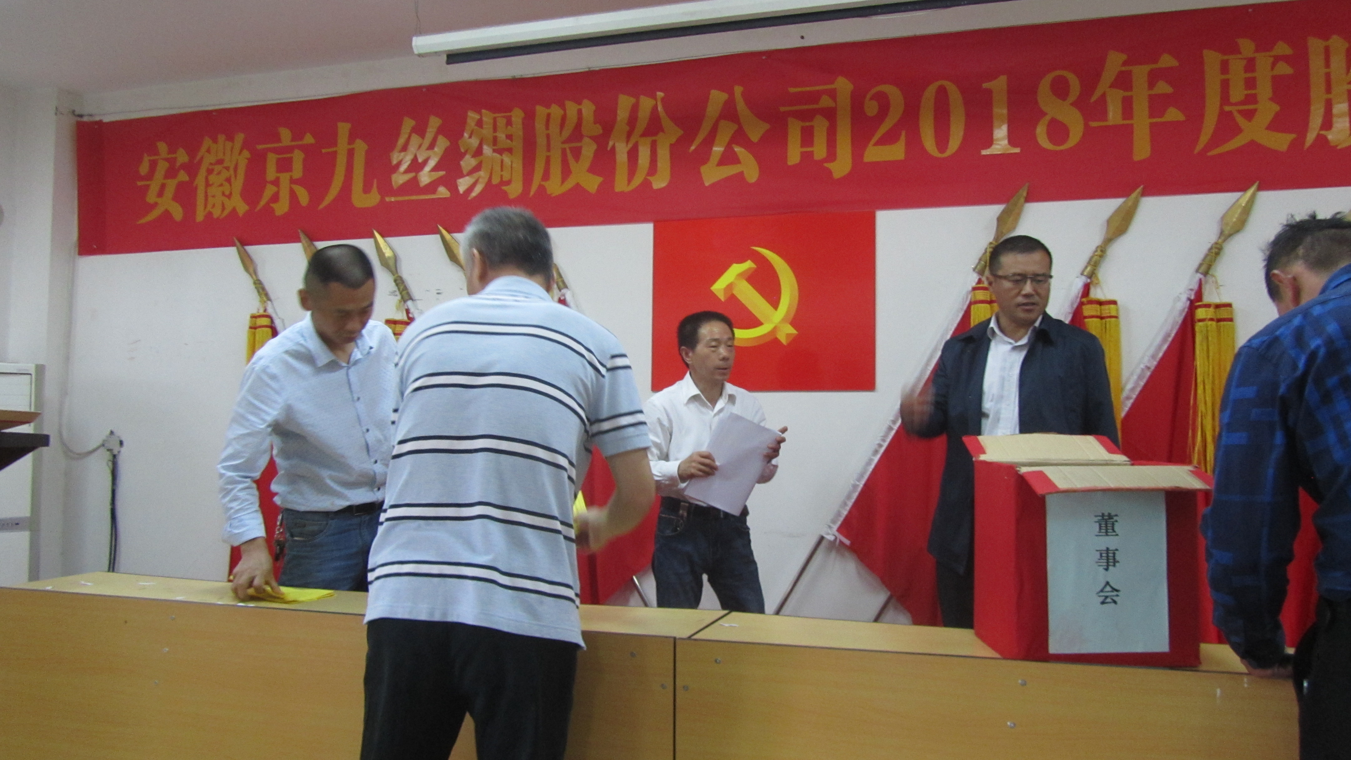 安徽京九丝绸股份公司2018年度股东大会于5月26日上午在公司办公大楼四楼会议室召开,参加大会和委托参加大会的股东共56人,代表股权20710954元,占总股权数的93.1%,符合股东大会召开的条件。