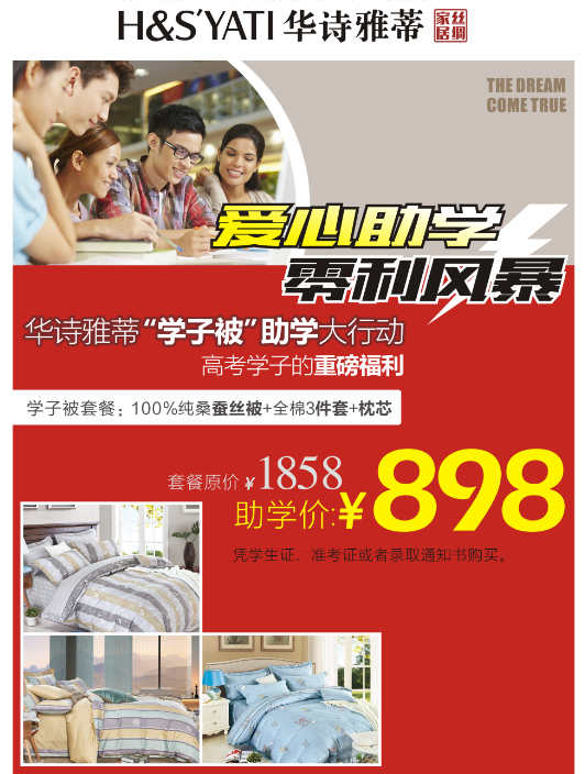 华夏丝绸博物馆暑期免费开放,对高考的准大学生还有重磅福利哟! 华夏丝绸博物馆是国家AAA级景点,社会科学知识普及基地,国家丝绸品牌建设重点工程,集丝绸历史、文化展示、桑蚕科普、丝绸产品等实物与现代声光电技术相结合,为您带来视觉享受。 传承中华文明,弘扬丝绸文化。华夏丝绸博物馆欢迎您! 文末福利 【大学梦 助学情】华诗雅蒂“学子被”助学大行动! 华诗雅蒂特为准大学生们量身定做一批学子被,让你轻松上大学! 学子被套餐组合(纯桑蚕丝被+全棉3件套+枕芯)。原价:1858元,助学价:898元。 凭准考证、学生证或录取通知书购买。 华诗雅蒂各专卖店和商场专柜有售。 数量有限,售完即止。 咨询热线:400-187-9889