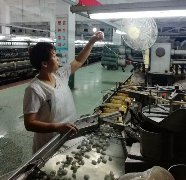 烈日炎炎,生产车间湿热难耐,员工更是挥汗如雨,衣服如同水洗。缫丝车间车头的地方由于要进汽索绪,周围温度更是如同火炉,叫人难以适从。但是你瞧:缫丝四车间的范学艳,拿着一粒蚕茧在日光灯下聚精会神地观察,确认它是不是内印茧,会不会影响生丝的品质。她要在保证生丝质量的前提下,最大限度地发挥原料价值,不随意浪费一粒茧、一寸丝,她已经忘记了周围的环境,进入忘我的工作状态!她把那颗对企业的赤诚之心和无私奉献的精神融入在工作中,融进了产品里。她没有豪言壮语,却用最平常、最简单的动作诠释着她对企业的忠诚和热爱。 再看这一位: