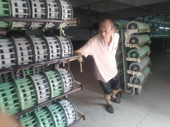 复整车间,因为工作的需要,星罗密布的汽管整天散发着必要的而又令人讨厌的热量,给本来就闷热的车间增添了无数的“火气”。每年最热的季节,也是缫丝生产量最大的时候,复整车间生产任务自然就重了许多。在车间人员并不充足的情况下,拍水工姜峰,为了保证把上道工序的生产器材及时送到指定地点,不影响正常生产,他毅然地前推后拉一个顶俩,甚至都顾不上擦一把那满脸的汗水!可你们知道吗?他每隔一会就要去更衣室把衣服脱下来拧拧水,要不穿在身上会影响工作效率,可见他每天要出多少汗,这也能解释为什么他一位壮如牛的汉子能晕倒在岗位上! 我们再看看这一位: