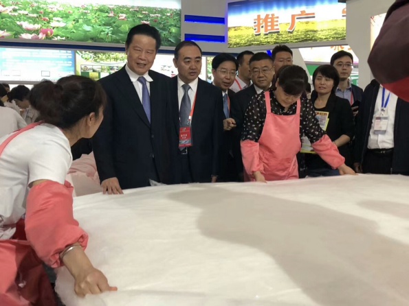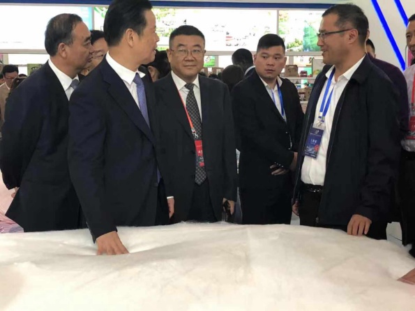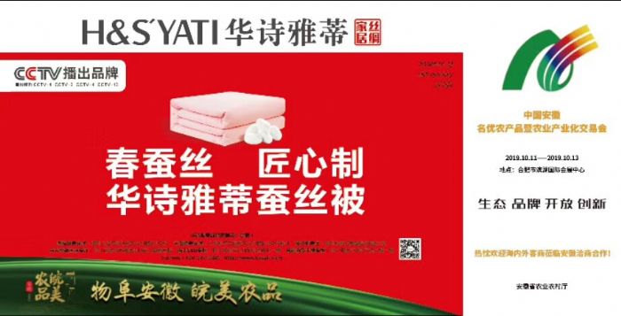 10月11日,由国家农业农村部、安徽省人民政府共同主办的中国安徽名优农产品暨农业产业化交易会(2019·合肥)在滨湖国际会展中心开幕。华诗雅蒂作为安徽知名品牌和CCTV 央视播出品牌,如期参展,精彩亮相合肥农交会。开幕式结束后,省政协主席张昌尔在阜阳市长孙正东、市农业农村局领导一行陪同下莅临阜阳馆华诗雅蒂展厅,华诗雅蒂总经理潘树利热情洋溢地接待了领导一行的到来。张主席认真观看华诗雅蒂蚕丝被现场制作过程并与参展人员亲切交谈,详细了解企业生产和产品销售情况,对华诗雅蒂品牌深加工和产业扶贫取得的成绩给予充分肯定,并叮嘱企业要研发出更多更好更有市场竞争力的丝绸产品,实现更大的社会效益和经济效益。