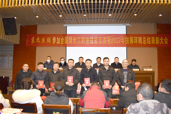 12月3日下午,京九丝绸参加全国缫丝工职业技能竞赛暨2022年技师评聘总结表彰大会在华夏丝绸博物馆二楼会议室隆重召开。颍州区总工会党组书记、副主席付超,公司董事长马品德,总经理周炎,公司各系统职工代表团团长葛炯、李开典、杨帆、潘树利出席会议。机关科室人员、班组长(店长)及以上管理人员、《京九丝绸》月刊通讯员、2021年度劳动竞赛受表彰人员以及2022年聘任的技师等近200人参加了会议。会议由公司机关职工代表团团长葛炯主持。