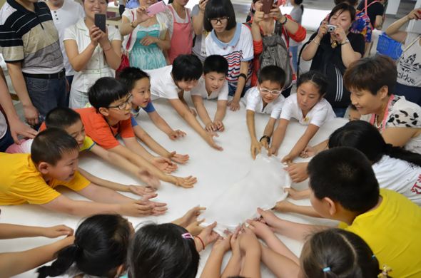 2014年5月31日,合肥市红星路小学参加华诗雅蒂领养蚕宝宝活动的学生代表、家长和老师一行50多人来到了华诗雅蒂颍上县桑蚕养殖基地,在讲解员的介绍下了解蚕桑的生长习性。随后又来到华诗雅蒂公司,参观了丝绸产品的生产流程。大家对如何选茧、蚕茧如何缫出生丝、又织成丝绸制品、如何剥茧、拉制蚕丝被非常感兴趣。虽然天空下着雨,但大家的热情不减,在讲解员的介绍下,红星路小学的师生和家长们对如何由蚕到丝的生产链有了更进一步的认识。在展厅,孩子和家长代表接受了随行记着的采访,表达了内心对蚕的奉献精神的敬佩,丝绸制品的精妙绝伦的赞赏,感叹丝绸文化的博大精深!也感谢华诗雅蒂给他们提供了这么好的机会走进丝绸,此行很有意义!